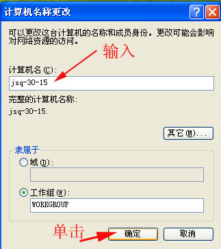 在“计算机名”输入框中输入: 例如 jsq-30-15 (前jsq为家属区的拼音第一字母 后为用户的楼栋号,再后为用户房号) 然后单击“确定”(别的选项都不要动)